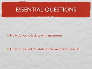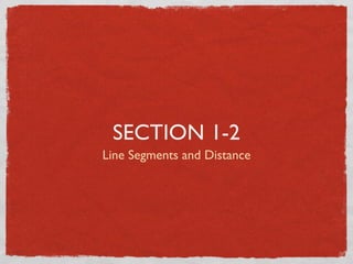 This document defines key vocabulary terms related to line segments and distance, including line segment, betweenness of points, congruent segments, and distance formula. It provides examples of calculating distances between points on number lines and using the Pythagorean theorem to find distances between points graphed on a coordinate plane. Examples include measuring line segments with a ruler, finding distances by adding or subtracting measures, and applying the distance formula and Pythagorean theorem to solve for unknown distances.