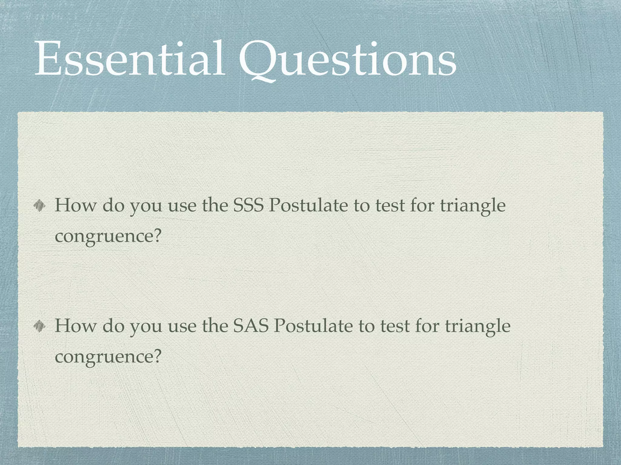 This document provides examples and explanations for proving triangle congruence using the Side-Side-Side (SSS) and Side-Angle-Side (SAS) postulates. It begins with definitions of key vocabulary like included angle. Example 1 uses SSS to prove two triangles congruent by showing that corresponding sides are congruent. Example 2 has students graph triangles on a coordinate plane and determine if they are congruent. Example 3 uses the midpoint theorem and vertical angles theorem to prove triangles congruent via SAS. The document concludes with practice problems for students.