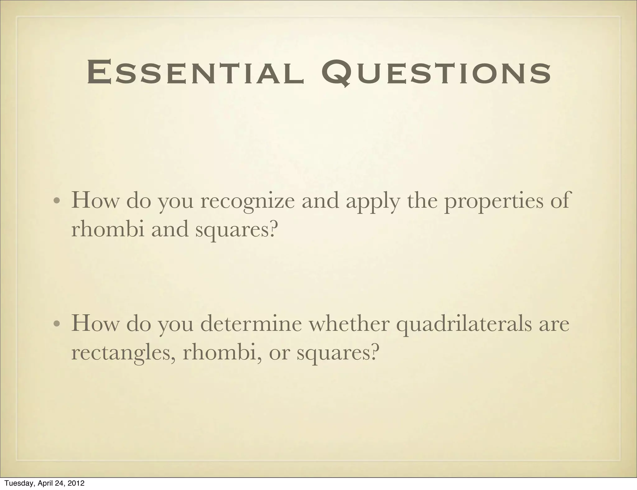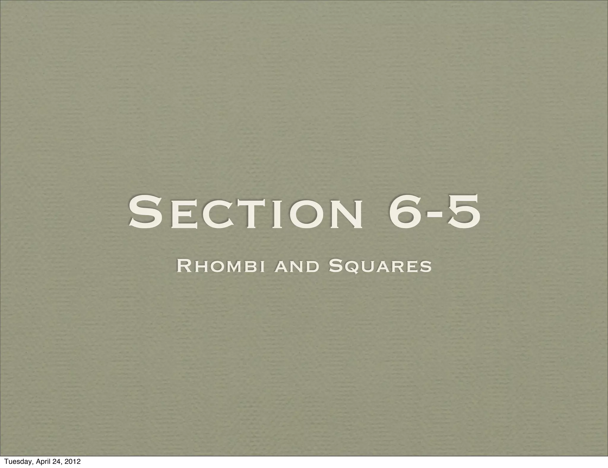 The document provides information about rhombi and squares including definitions, properties, theorems, examples, and a multi-step geometry problem. It defines a rhombus as a parallelogram with four congruent sides and lists its properties. It defines a square as a parallelogram with four right angles and lists common properties of squares, rectangles, and rhombi. Theorems are presented regarding diagonals of rhombi and conditions for rhombi and squares. Examples demonstrate using the properties and theorems to solve problems about classifying and determining measures of quadrilaterals.