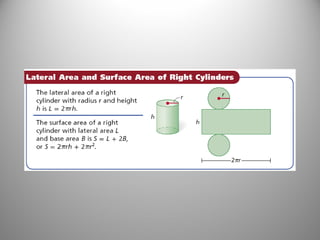 This document provides instruction on calculating the surface areas of prisms and cylinders. It defines key terms like lateral face, altitude, and axis. It presents formulas for calculating the surface area of right rectangular prisms and right cylinders. Examples are provided to demonstrate calculating surface areas of various prisms and cylinders. The document also addresses how surface areas change with modifications to dimensions and provides a word problem comparing the surface areas of different shapes.