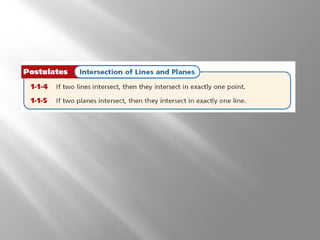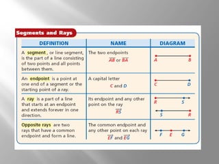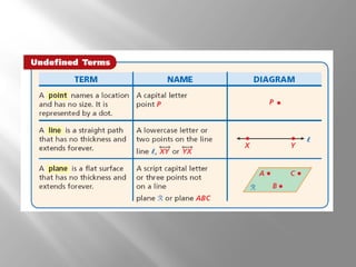 This document provides an introduction to points, lines, and planes in geometry. It defines key terms like point, line, segment, ray, and plane. It provides examples of naming and drawing different geometric shapes involving these concepts, like naming coplanar points, drawing segments between two endpoints, and representing the intersection of lines and planes. The document emphasizes that points, lines, and planes are basic undefined terms in geometry and introduces concepts like collinear points, coplanar points, and using dashed lines to represent hidden parts of figures.