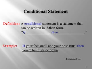 Conditional statements relate two parts, a hypothesis and conclusion, using "if-then" logic. The hypothesis follows "if" and is the given condition, while the conclusion follows "then" and is the result. Symbols like implies (®), not (~), and (Ù,Ú) can also represent conditional statements and connect multiple statements. A conditional statement is only false if the hypothesis is true but conclusion is false. Contrapositives and converses of conditional statements are also considered in determining logical equivalencies.