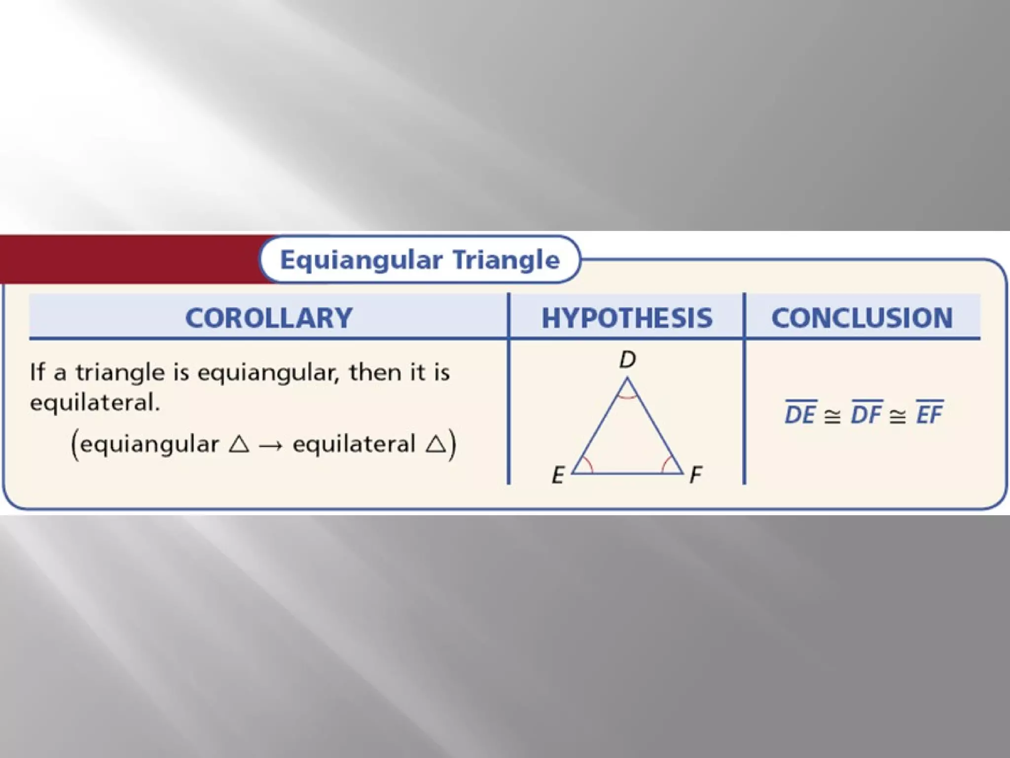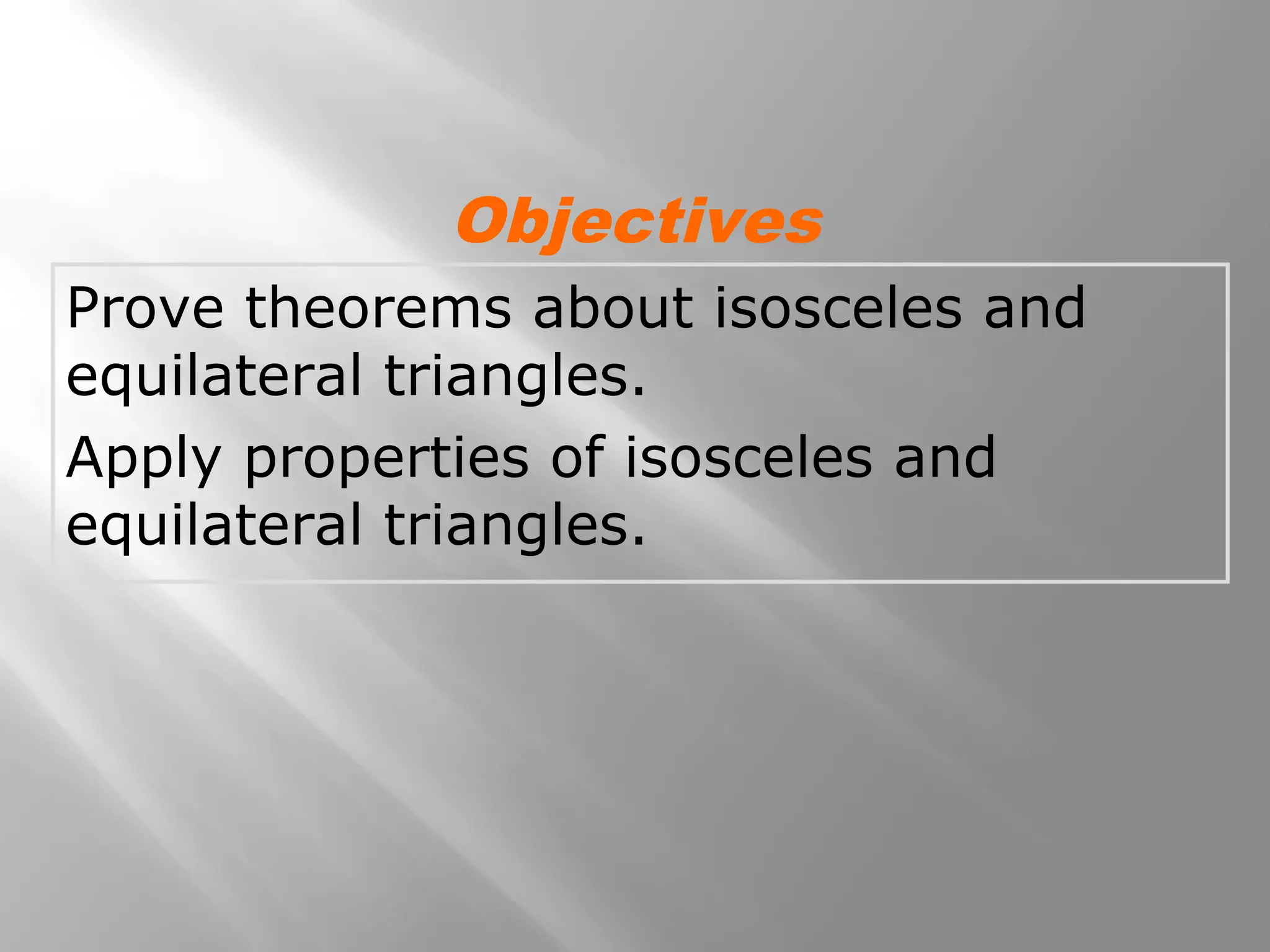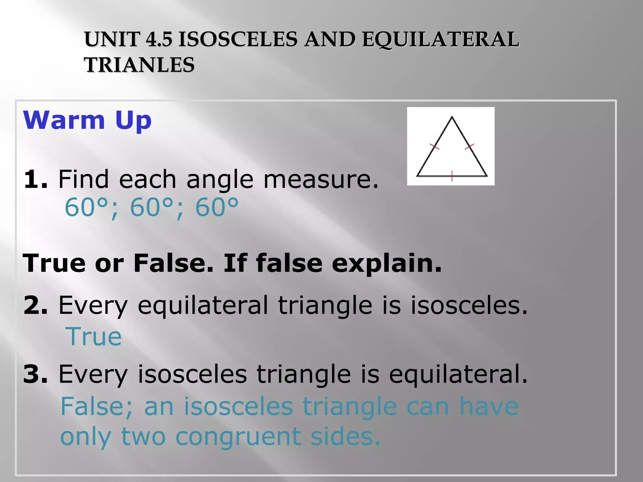 This document covers properties of isosceles and equilateral triangles. It defines key terms like legs, vertex angle, and base of an isosceles triangle. It presents theorems like if a triangle is isosceles, the vertex angle is equal to the base angles, and the bisector of the vertex angle is the perpendicular bisector of the base. Examples demonstrate using these properties to find missing angle measures. The connection between equilateral and equiangular triangles is also explained. Coordinate proofs may be used to show triangles are isosceles. Practice problems are included to assess understanding.
