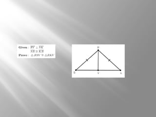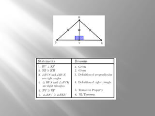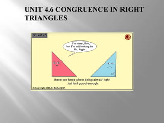 This document discusses four theorems for proving congruence of right triangles: the Hypotenuse-Leg theorem, Hypotenuse-Angle theorem, Leg-Angle theorem, and Leg-Leg theorem. It provides definitions and explanations of each theorem, noting how they relate to existing angle-side-angle (ASA, AAS, SAS) postulates for proving triangle congruence. Examples are included to demonstrate application of the Hypotenuse-Leg theorem.