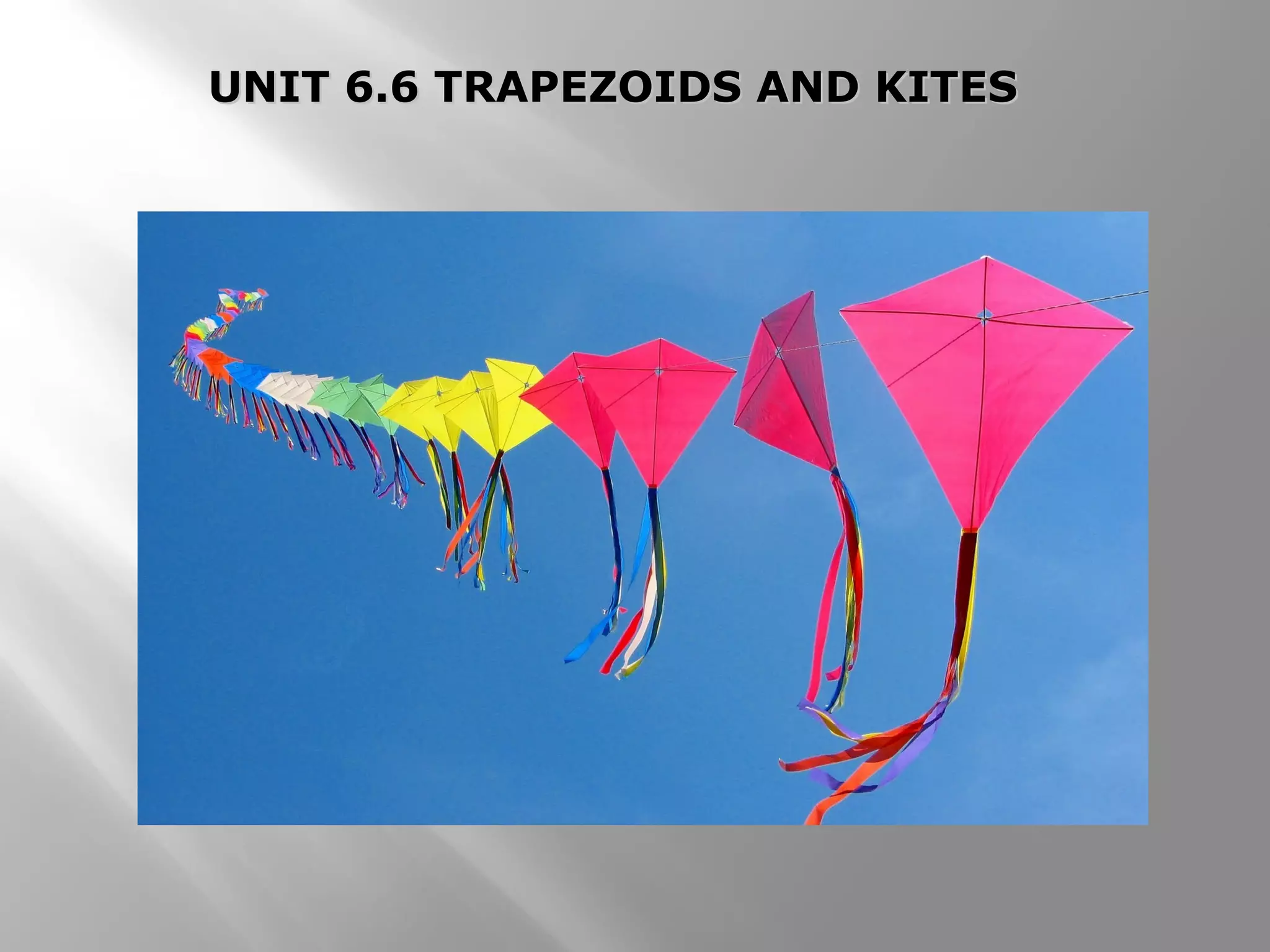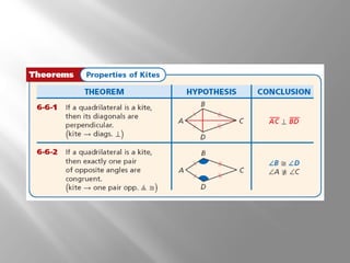 This document provides information about properties of kites and trapezoids. It includes examples of using properties of kites to solve problems involving finding missing angle measures. Examples also demonstrate using properties of isosceles trapezoids, such as the fact that base angles are congruent and legs are congruent. The document concludes with the trapezoid midsegment theorem and examples applying it to find missing segment lengths.