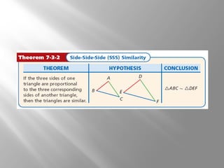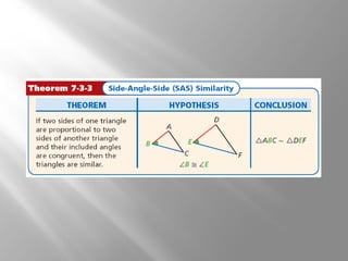 This document discusses proving triangles are similar using the AA, SSS, and SAS similarity criteria. It provides examples of using these criteria to prove triangles are similar, find missing side lengths in similar triangles using proportionality, and write proofs involving similar triangles. Applications to engineering problems are also presented. The key methods covered are using corresponding angles or sides that are equal to prove triangles are similar, setting up proportions between corresponding sides in similar triangles to solve for unknowns, and structuring multi-statement proofs involving similar triangles.