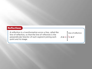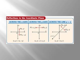 This document provides examples and explanations of reflections in geometry. It begins with examples of identifying reflections and drawing the image of a figure reflected across a line. It then gives examples of reflecting figures in the coordinate plane by changing the x- and y-coordinates. The document concludes with practice problems reflecting triangles across lines and in the coordinate plane. The overall purpose is to teach students how to identify and draw reflections as isometries in geometry.