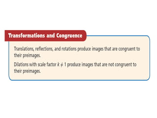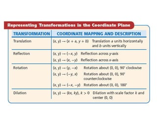 This document discusses transformations of geometric figures in the coordinate plane. It begins with examples of drawing pre-images and images of figures after translations, reflections, rotations, and dilations, and identifying the specific transformation. It then discusses properties of rigid motions/isometries and using transformations to determine if figures are congruent. Examples prove that figures are congruent through a sequence of transformations.