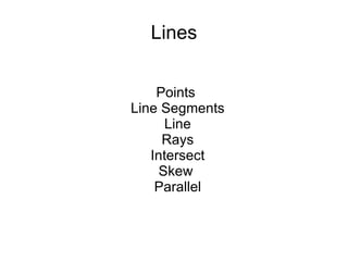 This document defines and describes basic geometry terms related to lines, angles, triangles, quadrilaterals, circles, and other polygons. It defines line segments, rays, intersecting and parallel lines. It also defines different types of angles such as acute, obtuse, right, straight, vertical and complementary/supplementary angles. Triangle types including right, obtuse, acute, scalene, isosceles and equilateral triangles are defined. Properties of quadrilaterals like parallelograms, rectangles, rhombuses, squares and trapezoids are outlined. Circle elements such as chords, diameters, radii, sectors and circumference are defined. Finally, it briefly mentions hexagons, octagons and regular