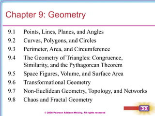 This document contains notes on perimeter, area, and circumference from a geometry textbook chapter. It defines perimeter as the distance around a shape and area as the surface covered. Formulas are provided for calculating the perimeter and area of polygons like triangles, rectangles, squares, parallelograms, and trapezoids. Circumference is defined as the distance around a circle, and formulas show circumference is equal to pi times the diameter or twice pi times the radius. The area of a circle is equal to pi times the radius squared. Examples demonstrate calculating perimeter, area, and circumference for various shapes.