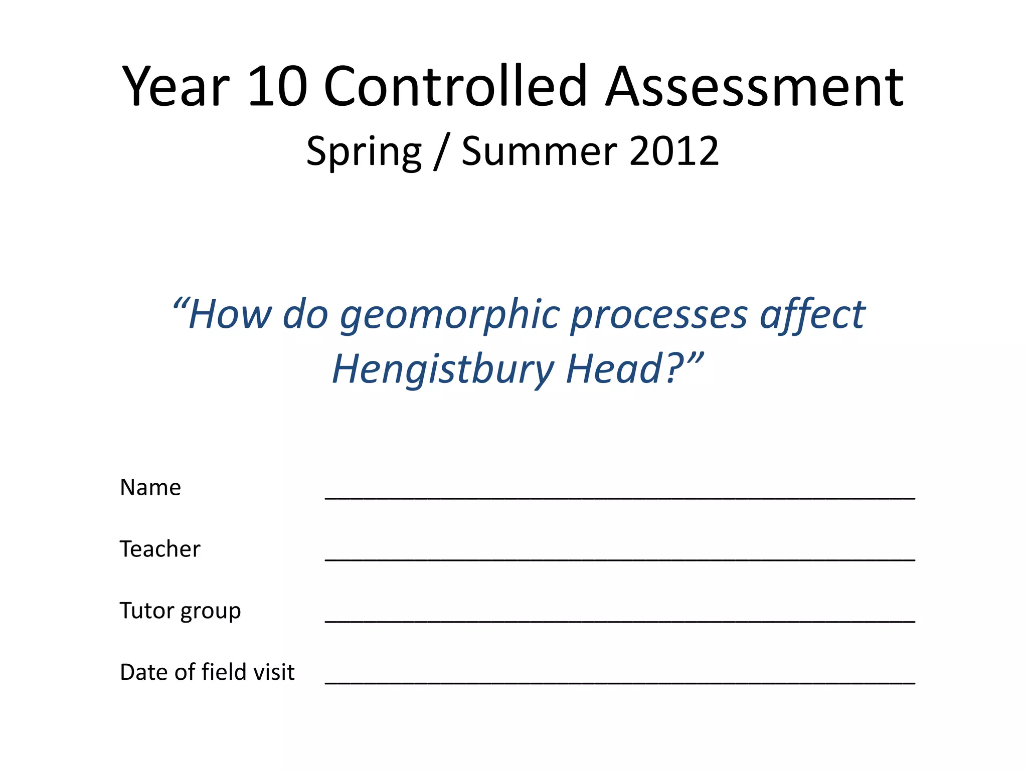 This document provides guidance for a student's controlled assessment on how geomorphic processes affect Hengistbury Head. It includes methodologies for collecting data on beach profiles, groyne exposure, and pebble measurements to analyze coastal erosion and protection. Sample data tables are given to record measurements from beach profiles taken at different sites, the exposed height of groynes updrift and dowdrift of wave direction, and attributes of pebbles collected from multiple sites. Questionnaires are provided to gather information from stakeholders on their coastal use and views on coastal management.