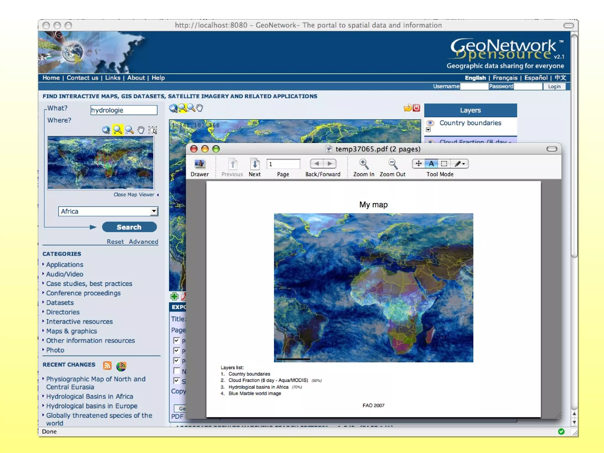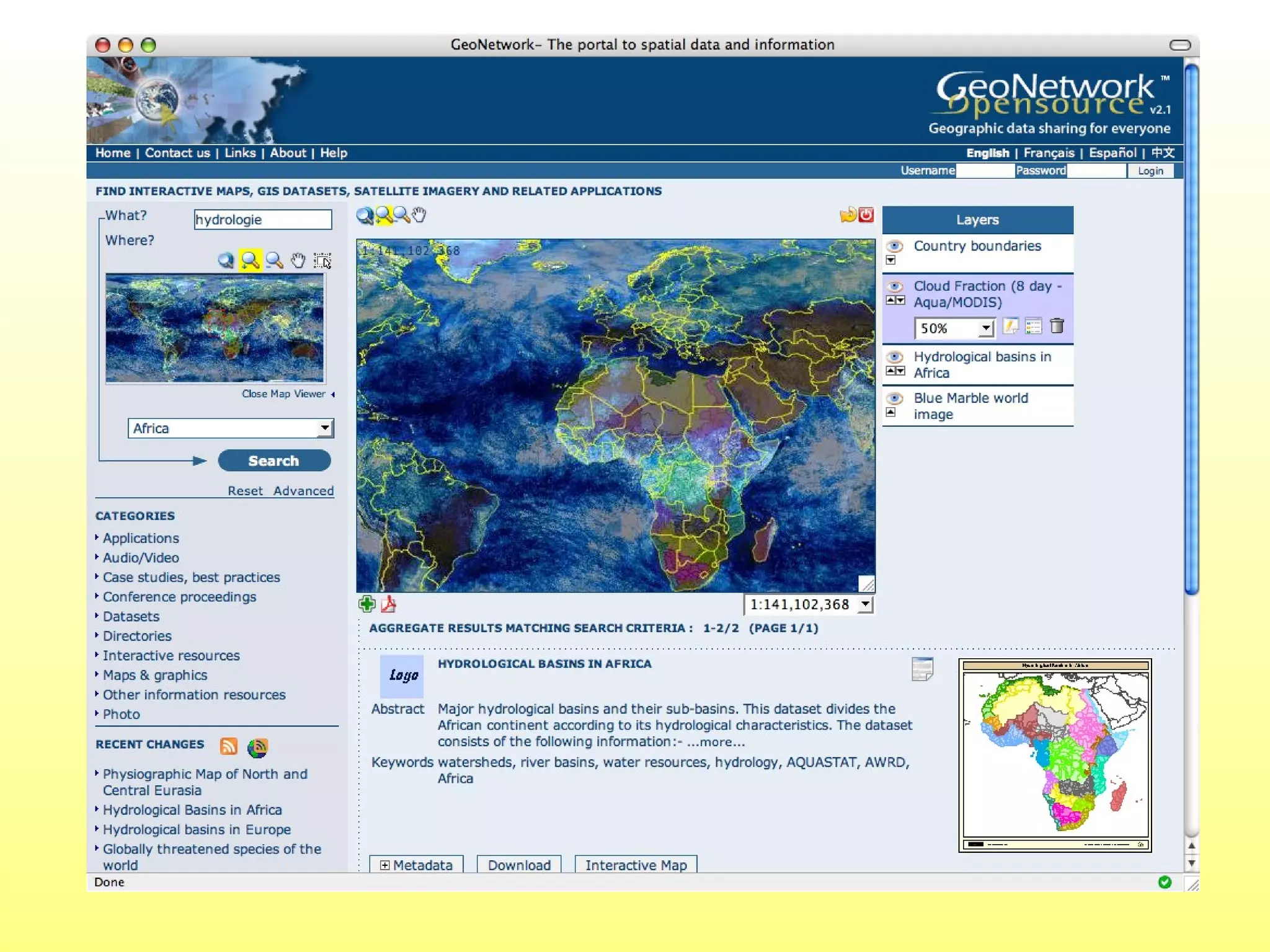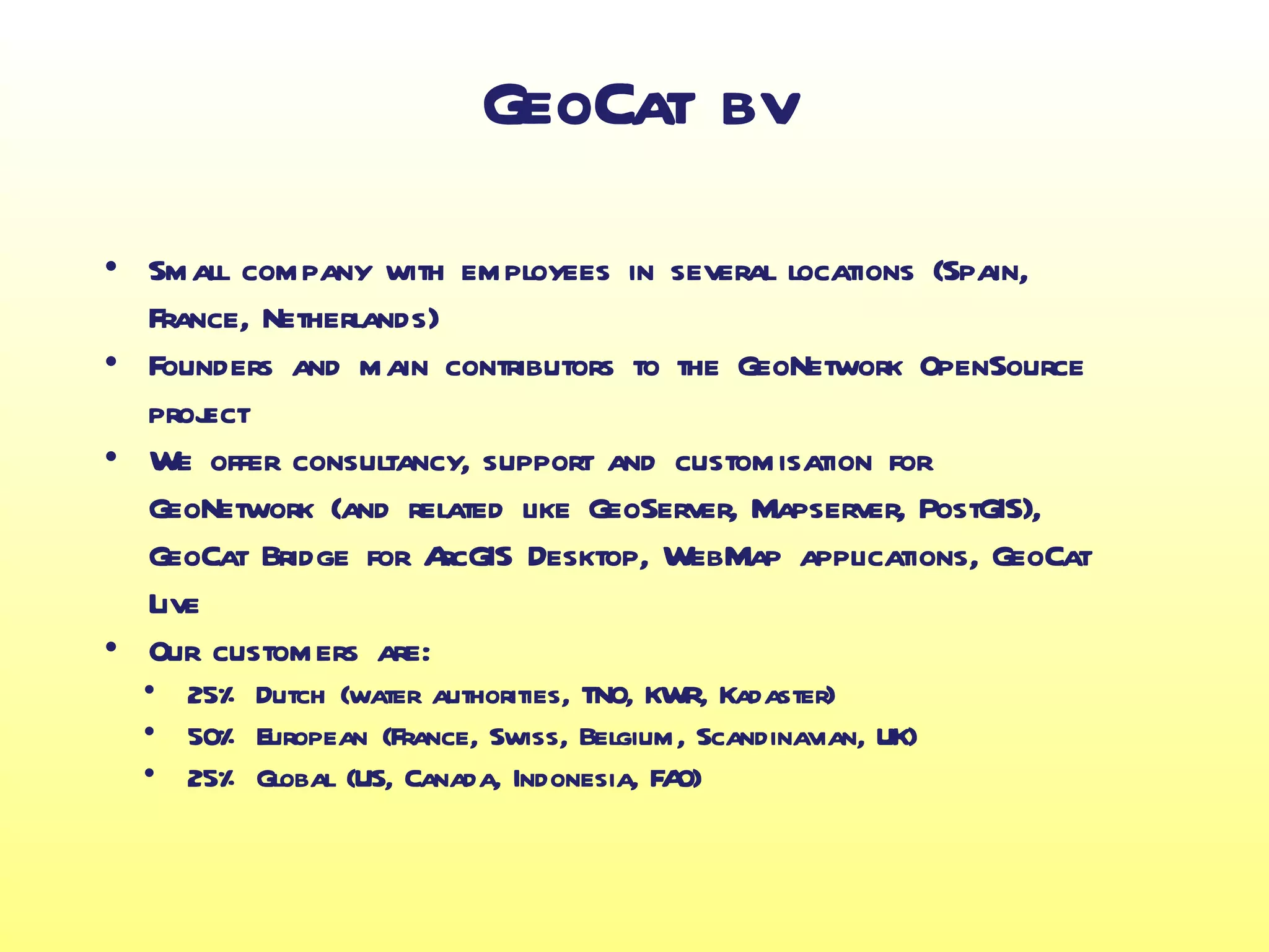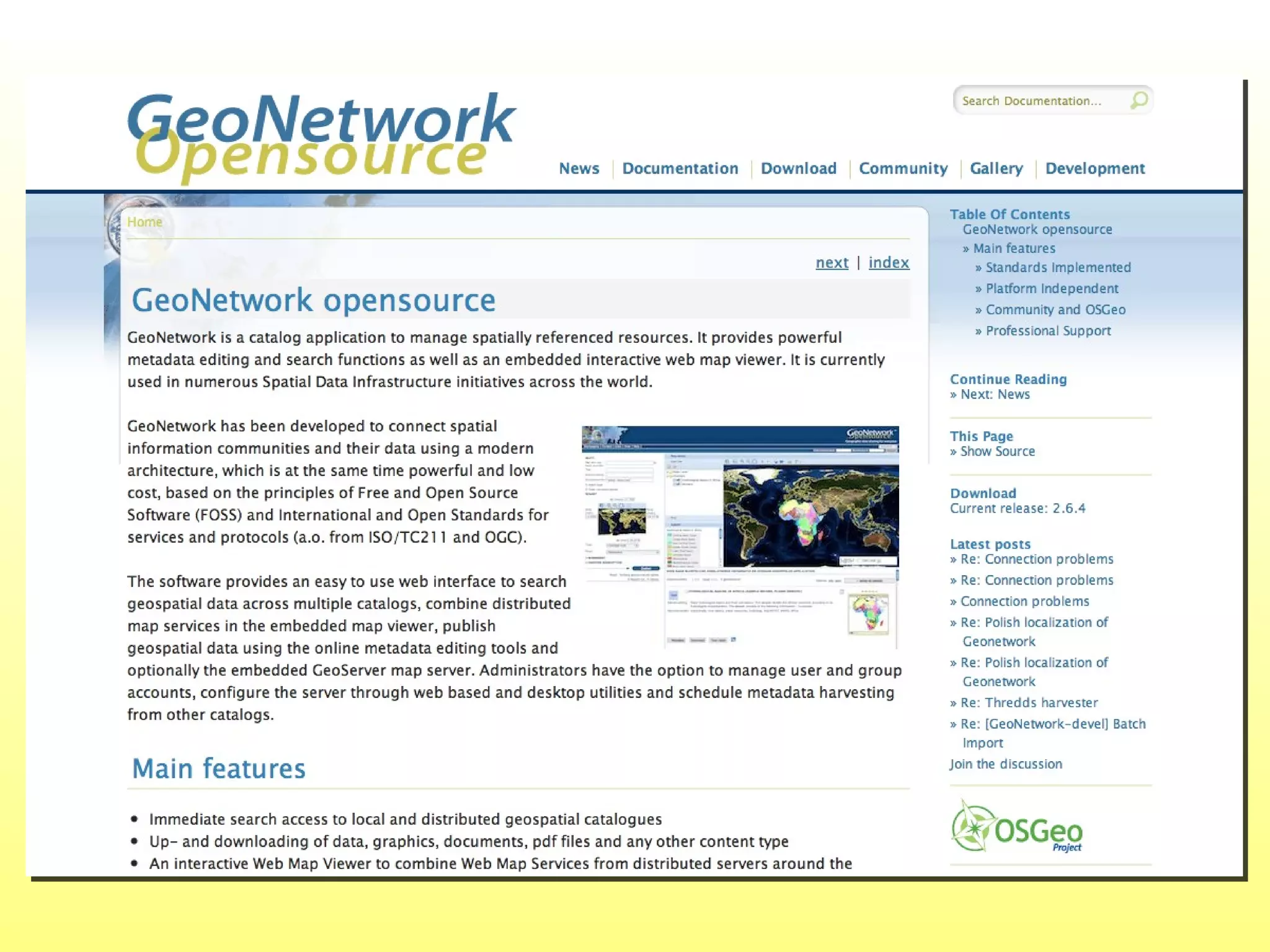 The document introduces GeoNetwork, an open-source metadata catalog for managing spatial datasets, highlighting its development history and essential features such as metadata harvesting and various integration capabilities. It emphasizes the software's compliance with international standards and its widespread use among various organizations globally. Furthermore, information about the active user community, software installation, maintenance, and recent updates is also presented.