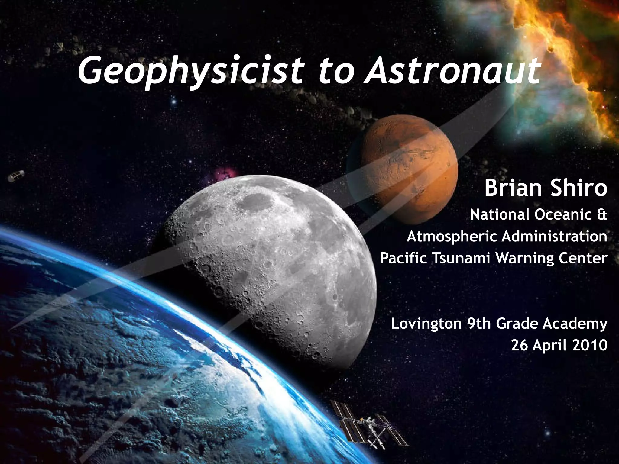 Brian Shiro, a geophysicist with the National Oceanic and Atmospheric Administration, shares his background, including his education and experience as an astronaut applicant. His work focuses on understanding and predicting environmental changes, as well as the application of geophysics to planetary science. Shiro provides insights into his job, astronaut training, and valuable life lessons for students interested in science and space exploration.