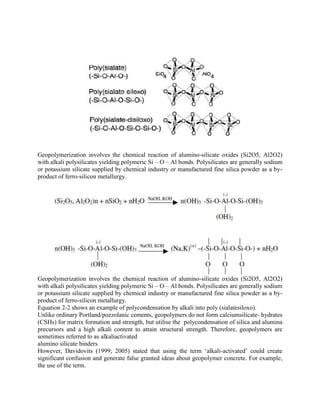 The document discusses geopolymer cement concretes as an alternative to traditional Portland cement concretes. Geopolymer cement concretes utilize industrial byproducts like fly ash and blast furnace slag instead of Portland cement, reducing CO2 emissions by around 80%. The cement industry contributes significantly to global CO2 emissions, so finding alternatives like geopolymer cement could help mitigate climate change issues. Geopolymer cement concretes form polymeric bonds between silica and alumina instead of calcium-silicate hydrates like Portland cement, but can achieve similar structural strength.