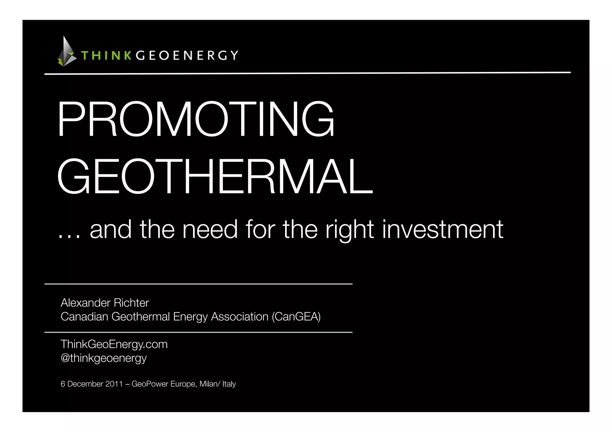 The document discusses the promotion of geothermal energy and the importance of effective marketing and public relations to enhance its public perception and industry position. It emphasizes the need for strategic investments, target group identification, and tailored promotion efforts to engage various stakeholders, including the general public, investors, and media. Additionally, it highlights the role of social media and other tools in increasing visibility and supporting the growth of the geothermal sector.