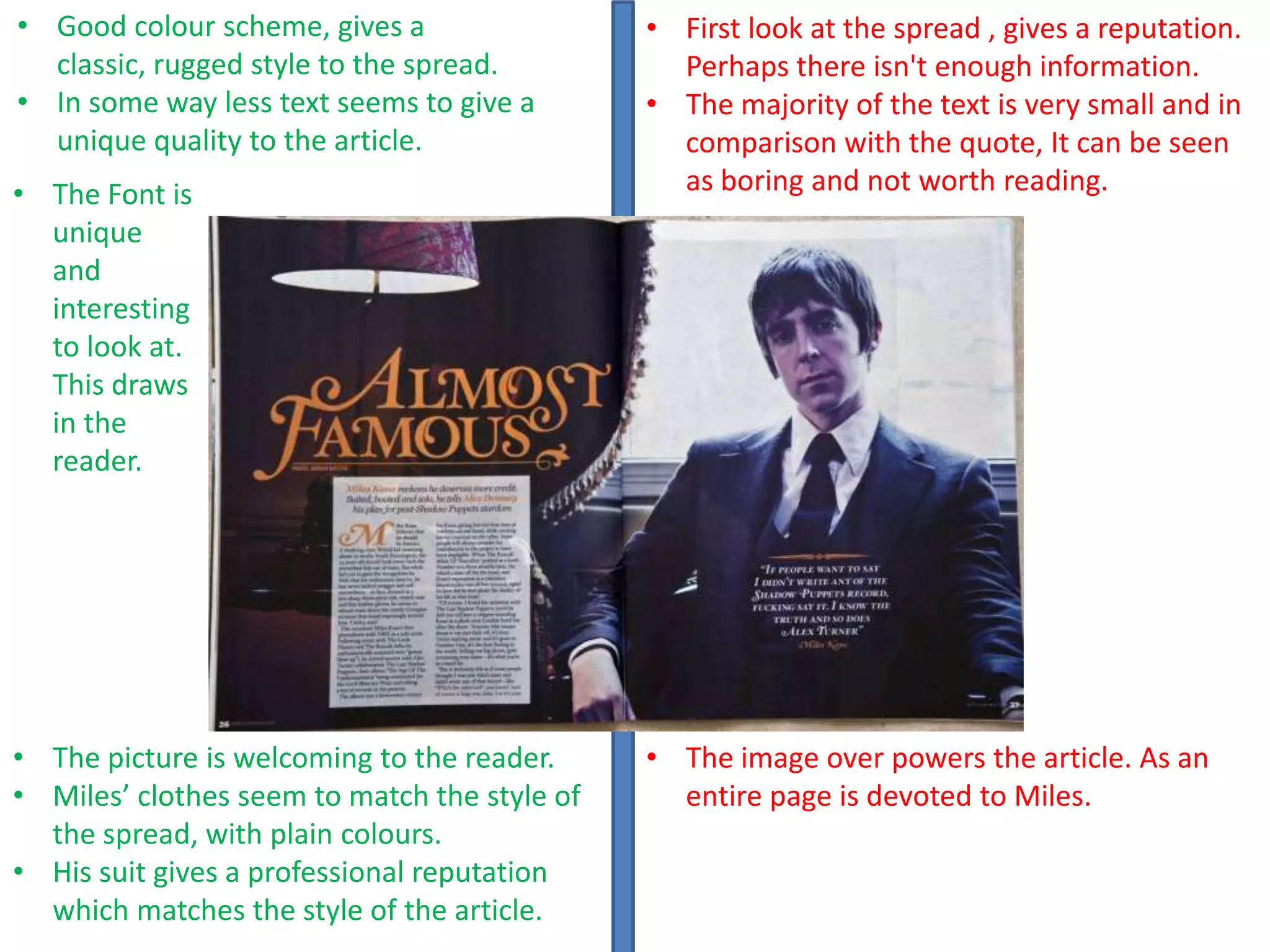 The document provides feedback on the design of a magazine spread. It notes that the color scheme gives a classic style but that the red is a bold contrast. The font and picture are praised but it is noted that the image overpowers the article and there is not much text. The overall spread is described as boring and not catching the reader's eye due to the dull colors and small amount of text compared to the large image.