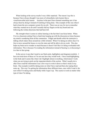 The document discusses the results of Lacey George's learning inventory, which identified their primary learning style as visual/nonverbal. It provides characteristics of this learning style, including learning best from visual aids, pictures, diagrams, and working quietly alone or in small groups. It then lists several learning strategies for visual/nonverbal learners, such as using flashcards, highlighting, charts, diagrams, and translating words into visual symbols to facilitate remembering information.