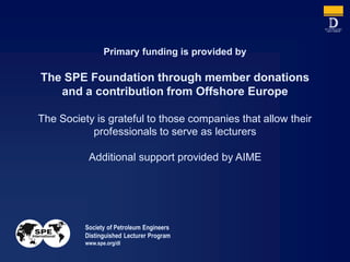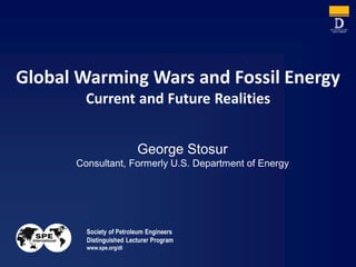 The document discusses the Distinguished Lecturer Program run by the Society of Petroleum Engineers (SPE). It is primarily funded by member donations and industry support. The program brings in expert lecturers to discuss topics like global warming, fossil fuels, and the linkage between human activity and climate change. The document outlines some of the key debates in this area between those who believe human activity is the primary driver of climate change and those who are more skeptical of this view.