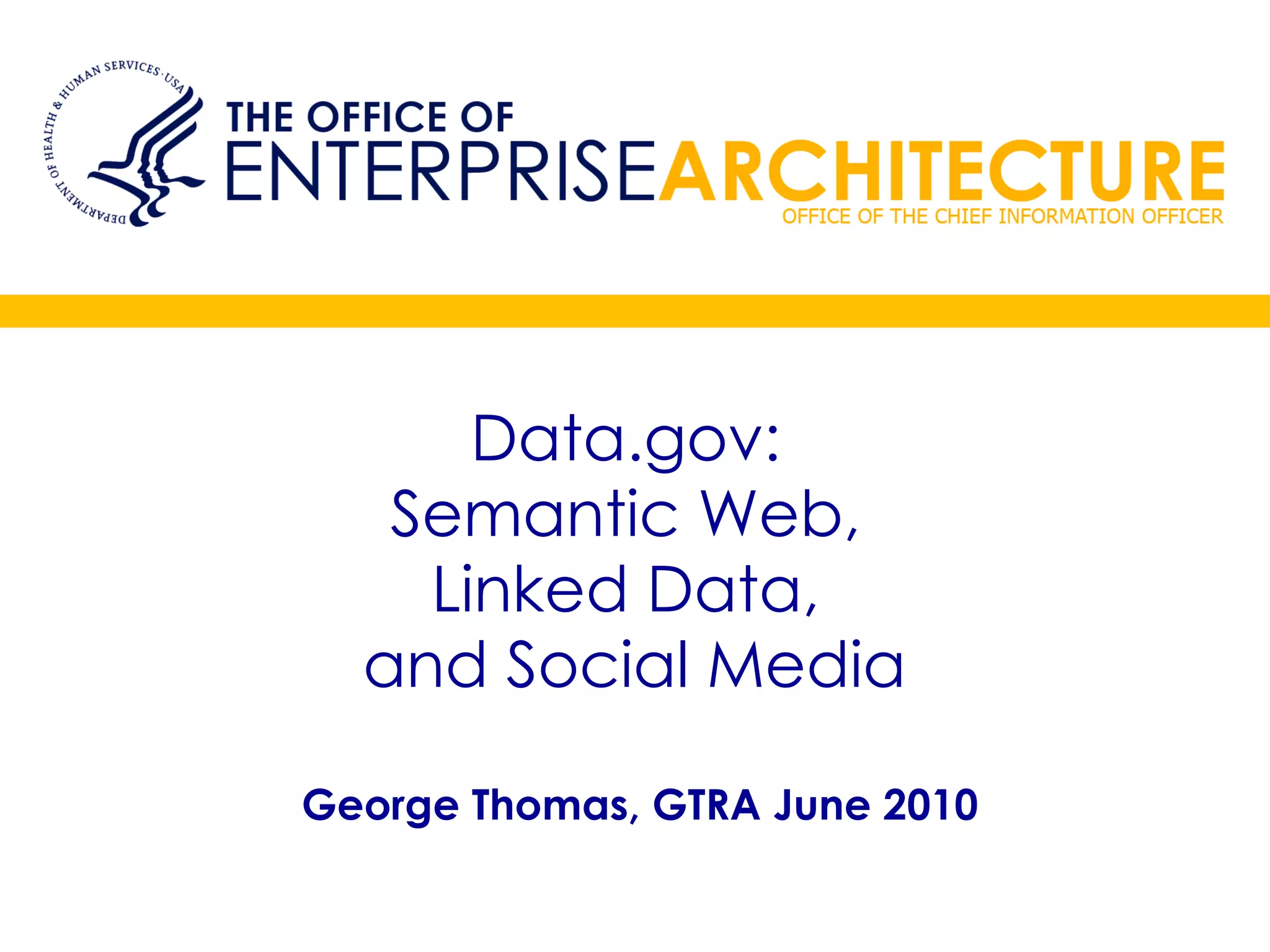 The document discusses using semantic web technologies like linked data and vocabularies to integrate government data on Data.gov. It describes how common and domain-specific vocabularies can be used along with URI schemes to connect related data across agencies. Interlinking vocabularies allow integration of metadata and data without changing existing schemas. Social media features could be added to make vocabularies and data function as social objects that users can annotate and discuss.