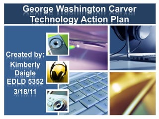 This document outlines George Washington Carver Technology Action Plan created by Kimberly Daigle for an EDLD course. It includes: