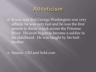 George Washington was said to be very athletic in his childhood, being able to throw a rock farther than anyone else across the Potomac River. He was also very punctual, allowing only a 5 minute difference for guests who came to dinner late. While he was not very successful in his first battle as a soldier, leading to the surrender of Fort Necessity, George Washington came to be known as the "Father of his Country" and viewed as a man of integrity by the founders of America for his role as the first US President and fighting for the beliefs of freedom and nation without God.