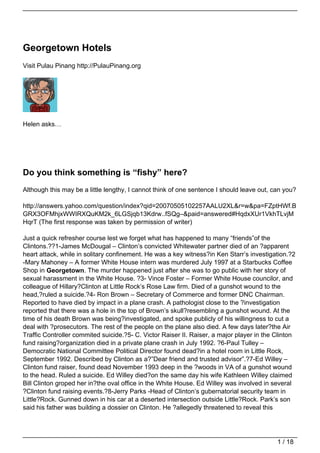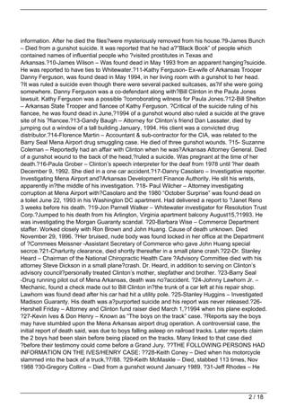 The document lists 47 deaths of individuals connected to Bill Clinton and his administration. Many of these deaths were deemed suicides but others questioned the official rulings. The deaths detailed include former Clinton business partners, associates, and potential witnesses involved in various investigations related to Clinton.