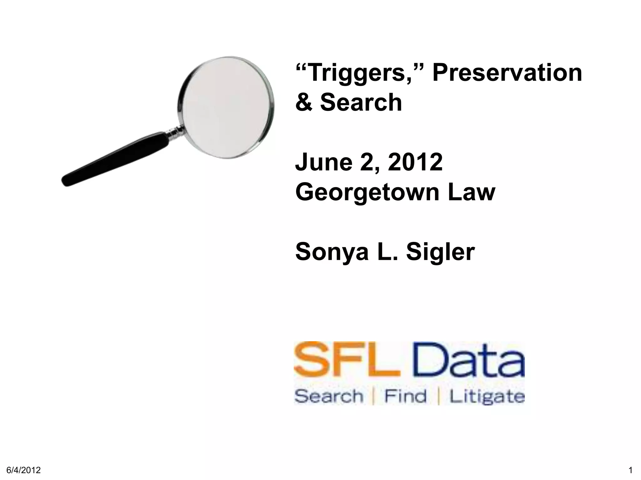 The document discusses the concepts of triggers, data preservation, and search methodologies related to litigation and e-discovery. It emphasizes the importance of properly identifying and managing data to prevent spoliation while examining the limitations of keyword searches and advocating for more advanced search techniques. Additionally, it highlights the evolving expectations of legal practices regarding defensibility and the establishment of best practices in data handling.