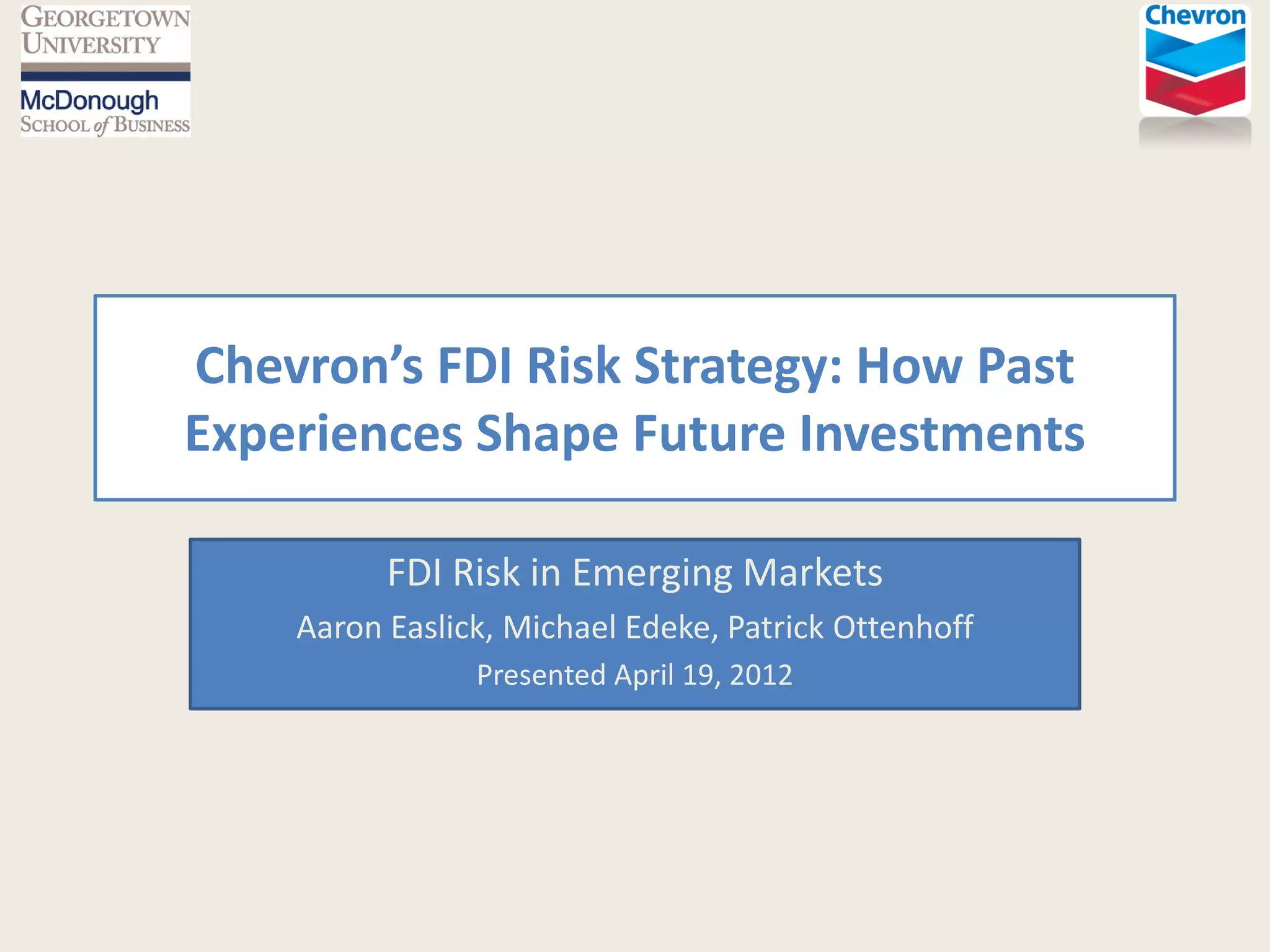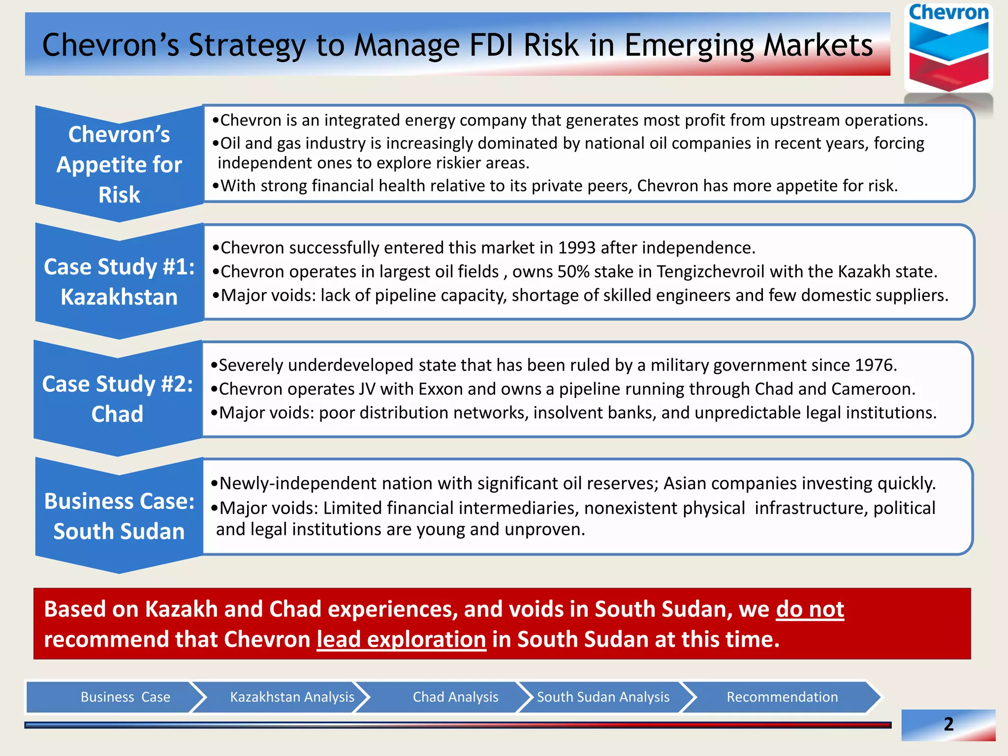 Chevron has had sustained success operating in Kazakhstan since entering the market in 1993 after the country gained independence. Chevron operates stakes in Kazakhstan's two largest oil fields through joint ventures with the national oil company. Chevron extracts over 291,000 barrels of oil per day in Kazakhstan and plans to increase output. Its experience working with the Kazakh government and overcoming voids like lack of infrastructure provides lessons for operating in other emerging markets like South Sudan.