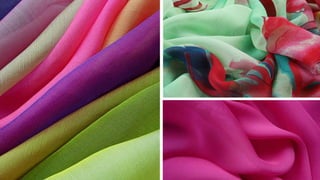 Georgette is a semi-sheer, crinkly fabric that is traditionally made from silk but can also be made from synthetic fibers. It was created by a Parisian dressmaker named Georgette de la Plante and is soft, drapable, and often used for scarves and flowing garments. Chiffon is another sheer fabric that can be made from silk, cotton, nylon, polyester or rayon. It has a faint shimmer and soft drape. Both georgette and chiffon are created using the plain weave technique where one thread goes over and under in an alternating pattern.