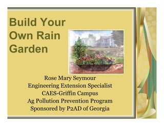 This presentation provides property owners with guidelines for constructing rain gardens to reduce nonpoint source pollution from their property. Rain gardens are shallow depressions planted with water-tolerant native plants that capture, filter, and infiltrate runoff from roofs, driveways, and other impervious surfaces. The presentation covers choosing a suitable location, sizing the rain garden, installing plants, and general maintenance requirements. To receive stormwater utility credits, rain gardens must meet local regulatory standards and be certified by an engineer.
