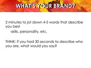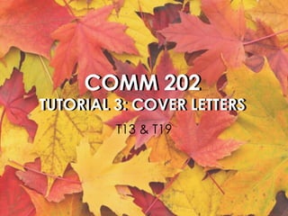 This document provides an overview and agenda for a tutorial on cover letters. It includes discussions on identifying one's personal brand, the purpose and elements of an effective cover letter, and examples of different parts of the cover letter like the opening, skills matching, and closing. The tutorial also covers how to write an accompanying cover email to apply for jobs. Students are provided with action items which include drafting two cover letter samples for peer review and submitting a skills matrix by a given deadline.