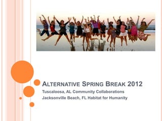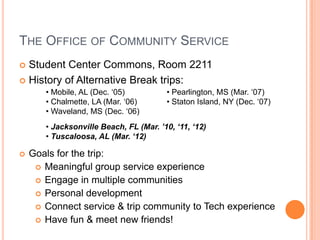 This document provides information about two alternative spring break trip opportunities in March 2012 through Georgia Tech's Office of Community Service - one to Jacksonville Beach, Florida to work with Habitat for Humanity and the other to Tuscaloosa, Alabama to assist with various community projects. It outlines the trip locations, schedules, costs, expectations for participants, and application process for the 20-person trips led by student leaders and faculty advisors.