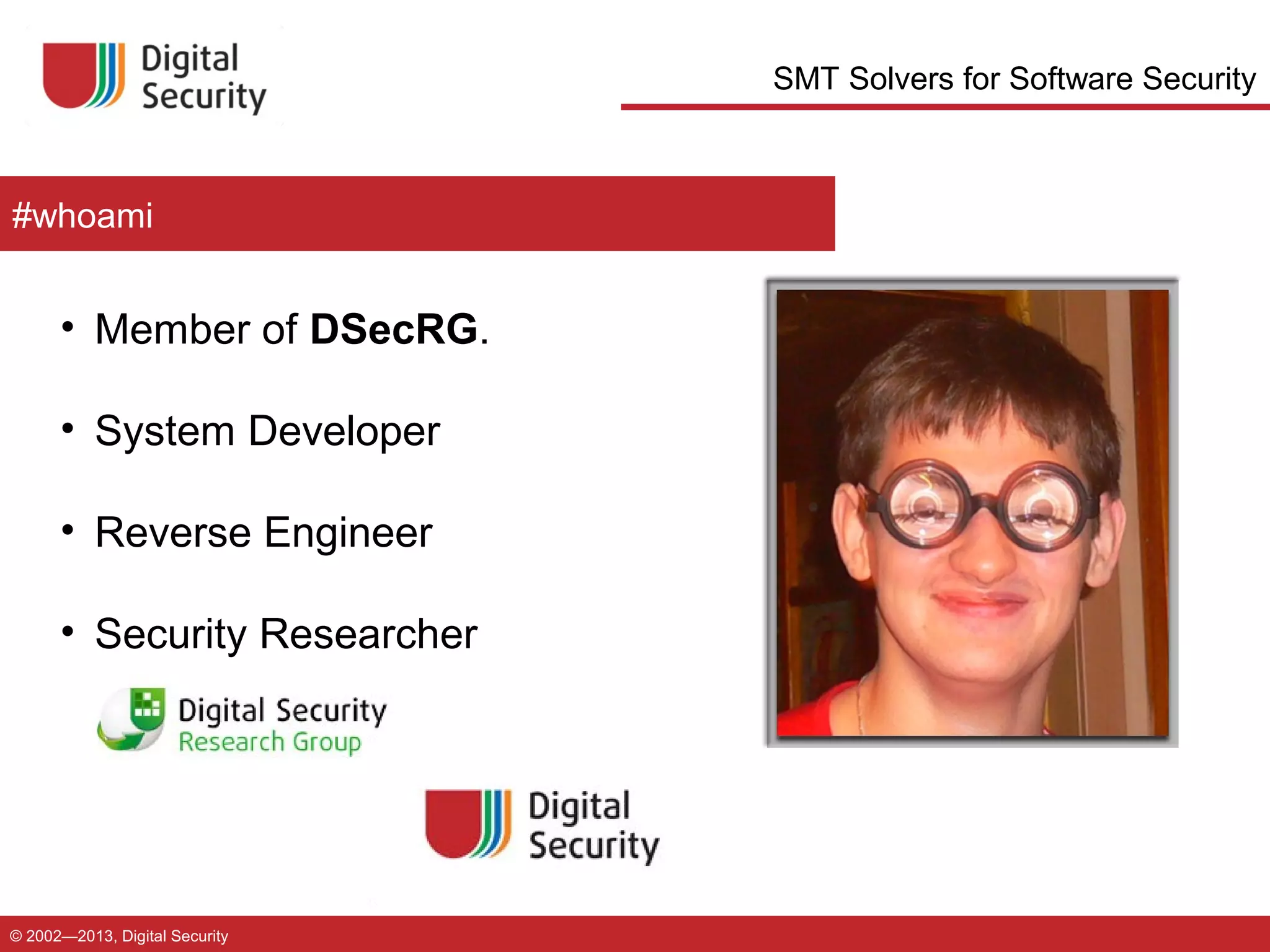 The document discusses how SMT solvers can be used for software security applications such as bug hunting, exploit generation, protection analysis, and malware analysis by modeling portions of code or algorithms as logical formulas that can then be analyzed using an SMT solver to prove properties or generate inputs. It provides examples of how SMT solvers have been used to find integer overflows, help with program verification, and aid in defeating simple hashing algorithms.