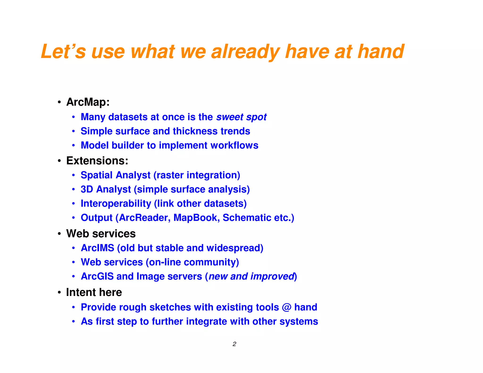 This document discusses using ESRI ArcGIS tools to perform geoscience analysis and visualization. It provides examples of using ArcMap, extensions like Spatial Analyst and 3D Analyst, and web services to [1] model simple surface and thickness trends, [2] compare ESRI tools to other gridding and contouring tools, and [3] demonstrate workflows for thickness mapping and contouring. The document concludes that ArcGIS tools can provide initial analysis and integration with other datasets but are not a replacement for specialized reservoir modeling packages.