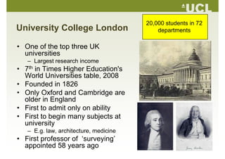 The document outlines UCL's extensive geospatial research initiatives, highlighting the university's rich history and diverse departments involved in geospatial studies. It details various research interests, methodologies, and technologies used across multiple domains, including civil engineering, environmental modeling, and geographic information systems. Additionally, it emphasizes UCL's commitment to interdisciplinary collaboration and the advancement of geospatial knowledge through innovative projects and teaching.