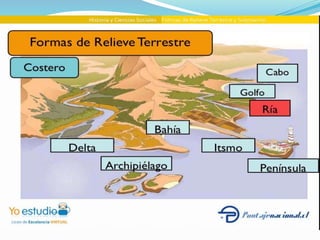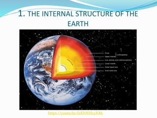The document summarizes key topics related to Earth's structure and relief formation. It describes the internal layers of the Earth including the crust, mantle, and core. It discusses plate tectonics and how the movement of tectonic plates leads to collisions and separations that form mountains and ocean ridges. It also outlines three main types of relief - continental, coastal, and ocean - and provides examples of associated landforms like mountains, valleys, beaches, and ocean trenches.
