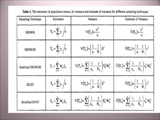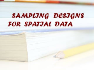 This document discusses geostatistics and its applications in geoinformatics. It begins with introducing key concepts like remote sensing, GIS, GPS and their history. It then discusses spatial sampling designs and geostatistics, which involves incorporating both statistical distribution and spatial correlation of sample data. Common applications of geostatistics and geoinformatics discussed include agriculture management, environmental management, infrastructure management and crisis management using remote sensing. It concludes with discussing different spatial sampling techniques like contiguous unit based spatial sampling and stratified contiguous unit based spatial sampling.