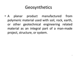 The document discusses different types of geosynthetics including geotextiles, geogrids, geomembranes, and geocomposites. It provides details on their manufacturing processes and applications in civil engineering projects. Geotextiles include woven, nonwoven, knitted, and stitched fabrics that are used for separation, filtration, drainage, reinforcement, and erosion control. Geogrids and geomembranes are stiff polymer sheets used for reinforcement and as barriers. The document outlines common functions of geosynthetics like separation, reinforcement, filtration, drainage, and erosion control. It provides examples of their applications in walls, waste water treatment, and other civil works. Properties discussed include physical characteristics and hydraulic