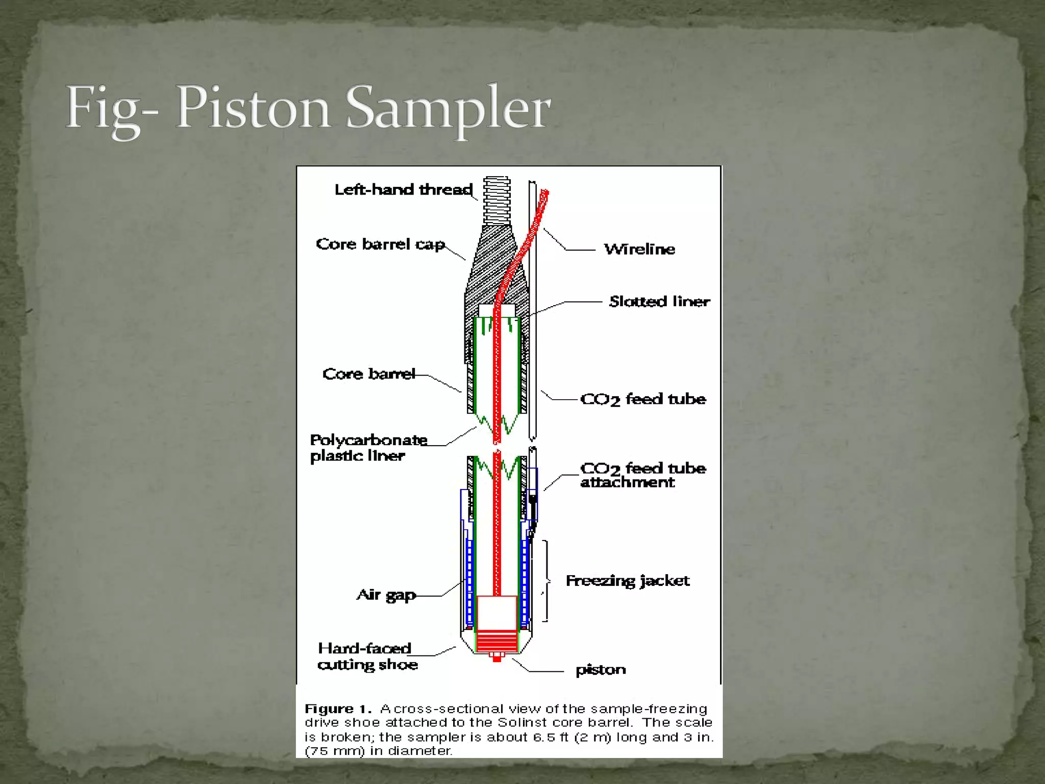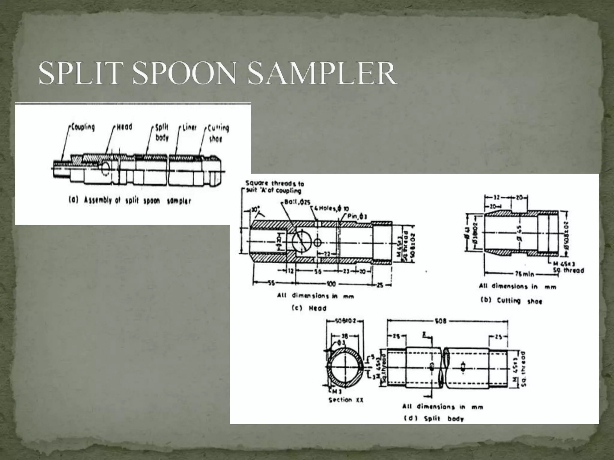 Soil sampling devices include open drive samplers, piston samplers, and rotary samplers. Open drive samplers use thin-walled tubes that are pushed into the soil to collect undisturbed samples. Piston samplers also use thin-walled tubes but have a piston inside to prevent excess soil from entering and maintain sample integrity. Rotary samplers have an outer rotating barrel and inner stationary tube to collect annular ring samples.