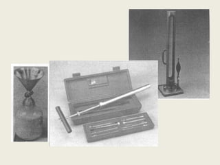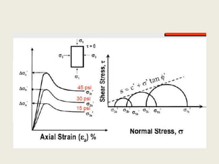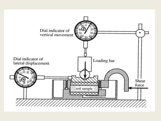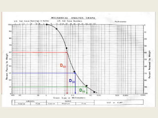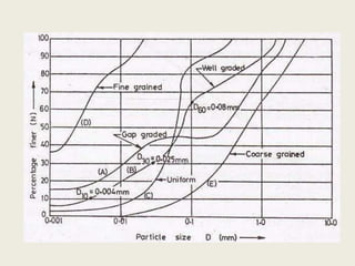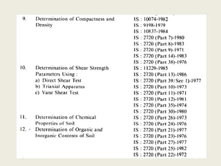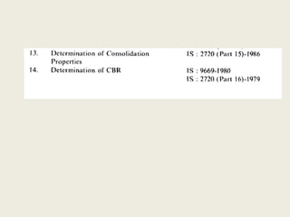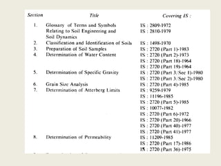This document provides an overview of geotechnical engineering testing aspects. It discusses soil classification systems, laboratory tests like moisture content, specific gravity, grain size analysis, Atterberg limits, and field density. Field tests like standard penetration test are also covered. The document outlines the Indian standard soil classification system and 18 soil groups. Key geotechnical parameters and their significance are defined.