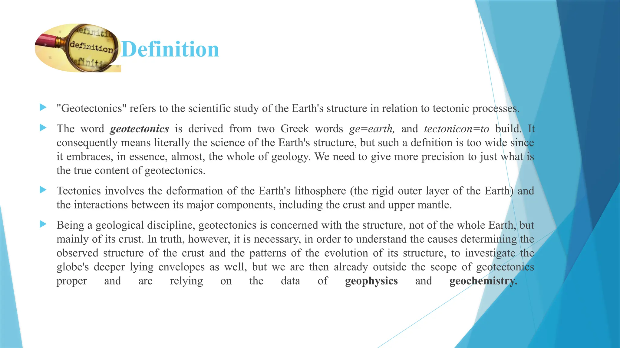 The word geotectonics is derived from two Greek words ge=earth, and tectonicon=to build. It