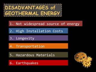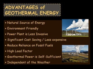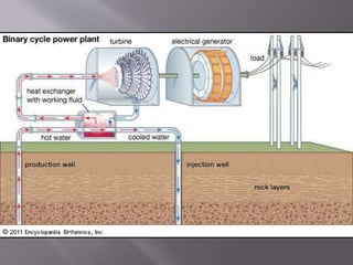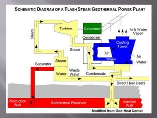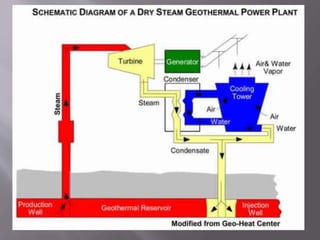 Geothermal energy is a clean and sustainable resource sourced from the Earth's heat, ranging from shallow ground to molten rock. Different types of geothermal reservoirs, classified by temperature, allow for various applications, including electricity generation through geothermal power plants that utilize steam or hot water. As technology improves, geothermal energy is becoming more cost-effective and is expected to play a significant role in future energy production.