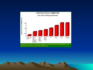 The document discusses different sources and types of geothermal energy. It describes how heat from the Earth's core can be harnessed through various technologies to provide direct heating and electricity. Geothermal energy comes from radioactive decay, residual heat from the Earth's formation, and meteorite impacts deep underground. Technologies like hot water reservoirs, natural steam reservoirs, and hot dry rock systems can extract this heat for applications ranging from home heating to electricity generation. The document also outlines both the environmental benefits and potential harms of geothermal energy development and production.