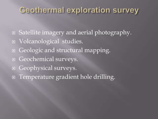 This document discusses geothermal energy and its applications. It begins by outlining the exploration methods used to identify suitable locations for geothermal energy production, which include satellite imagery, aerial photography, geological and structural mapping, and temperature gradient hole drilling. It then notes that suitable locations are often along tectonic fault lines. Several applications of geothermal energy are mentioned, including its use in power plants and residential settings. Specific installation methods for geothermal heat pumps are also outlined.