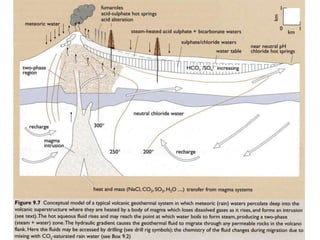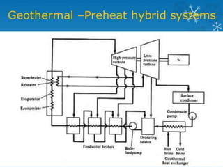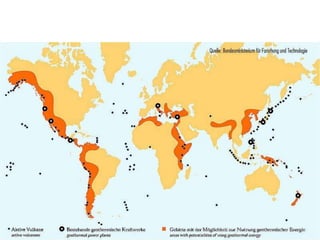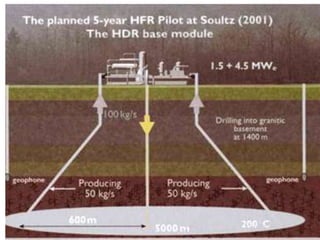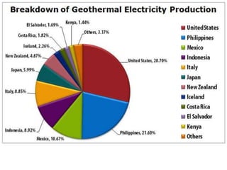 Geothermal energy is generated from the Earth's internal heat, primarily stemming from radioactive decay and pressure, with reservoirs of steam or hot water found beneath the surface. It is a renewable energy source accounting for a small percentage of global power generation, with significant potential in specific regions, including various geothermal fields and technologies applicable for direct heating and electricity generation. Despite its advantages, geothermal technology faces challenges such as seismic risks and environmental concerns that must be managed effectively.