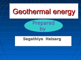 This document provides an overview of geothermal energy, including its history, types of geothermal power plants, potential sources in India, costs and environmental impacts. Hot springs have been used since ancient times for bathing. The Romans built the first commercial baths heated by geothermal springs. Modern uses include generating electricity via dry steam, flash steam and binary cycle power plants. India has significant geothermal potential, especially in the Himalayan region. While geothermal energy has low emissions, exploration and development costs are high due to uncertainty around usable resources underground.