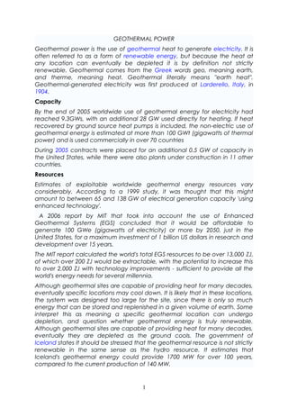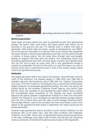 Geothermal power generates electricity by harnessing heat from within the Earth. It is considered a renewable resource, though specific locations can eventually be depleted as the ground cools over many decades. Three main types of geothermal power plants exist - dry steam, flash, and binary cycle plants. The largest geothermal facility in the world is The Geysers in California, while other significant sites include those in Nevada, Indonesia, and Kenya. Geothermal energy also shows promise for desalination and heating applications.