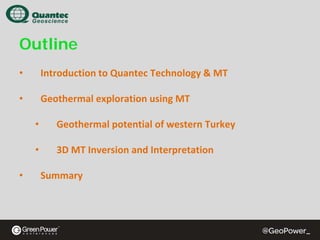 This document summarizes a magnetotelluric (MT) survey conducted in Denizli, Turkey to explore the geothermal potential of the region. The survey involved collecting high quality MT data from 92 sites using Spartan MT data loggers. The data was inverted in 3D using WSINV3DMT, producing resistivity models of the subsurface down to 3000 meters depth. The models image the sedimentary fill of the Denizli graben and the underlying bedrock, helping to identify potential geothermal reservoirs and determine well locations to reduce drilling risks. The MT survey was able to map subsurface resistivity variations despite the industrialized nature of the area, demonstrating the effectiveness of MT for geothermal exploration.