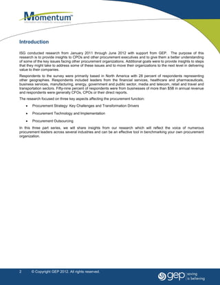 This document summarizes key findings from a survey conducted by ISG and GEP on procurement strategies and challenges. The top challenges cited were gaps in resource skills and lack of business unit support. While cost reduction targets were achievable, procurement struggled to influence high spend categories like professional services and marketing. Priorities for procurement included increasing strategic alignment, delivering cost savings, and expanding categories under management. Overall, the survey found opportunities for procurement to strengthen business partnerships, skills, and processes to drive more value.