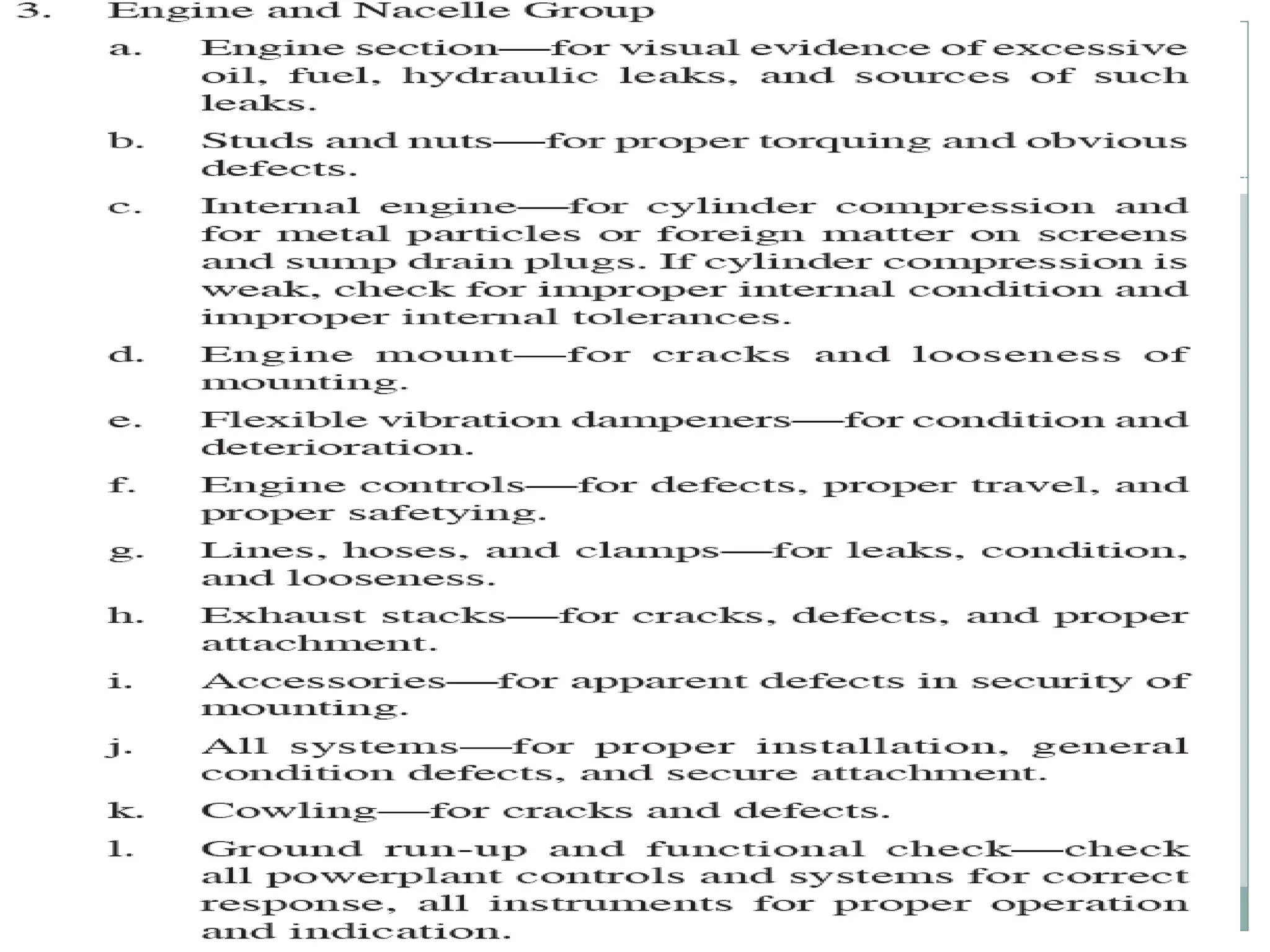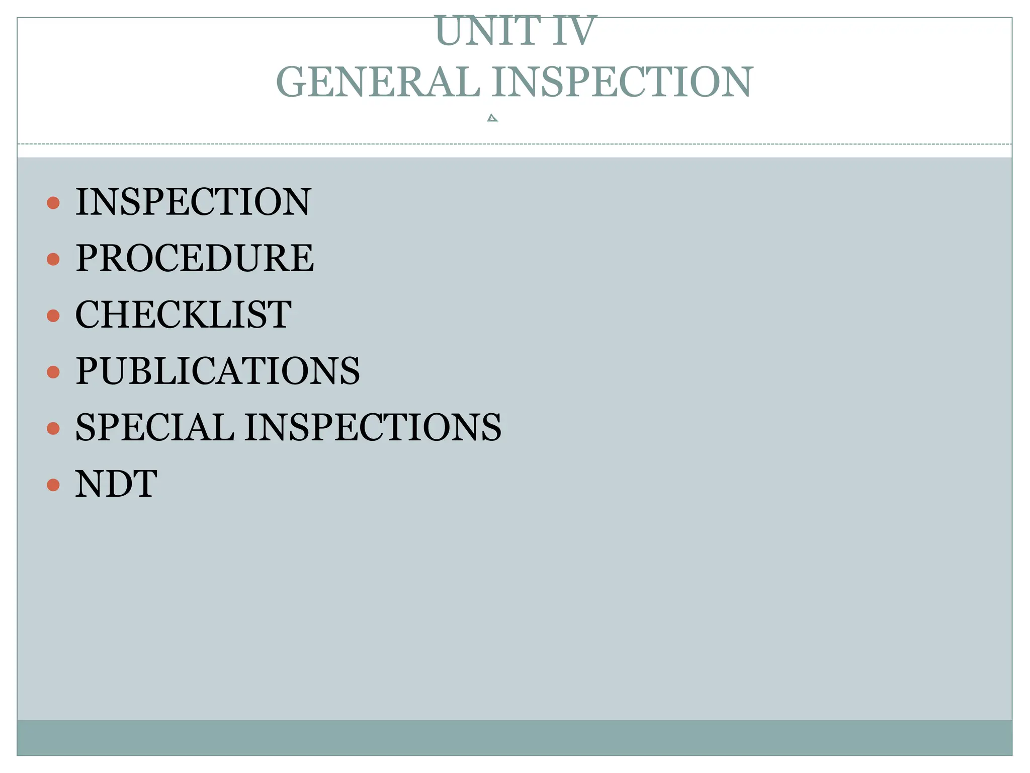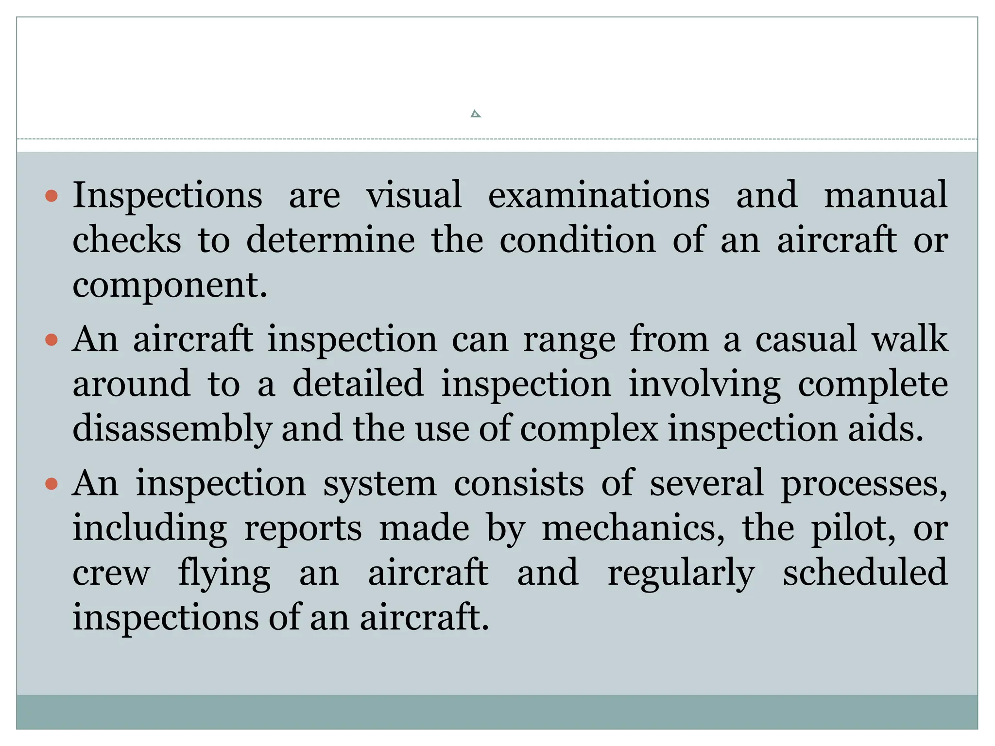 This document discusses general aircraft inspection procedures and techniques. It covers topics such as visual inspections, checklists, publications used for inspections like manuals and airworthiness directives, non-destructive testing methods, and special inspections required after events like hard landings, turbulence, or lightning strikes. The goal of inspections is to determine an aircraft's airworthiness and identify any defects or needed maintenance through systematic examination of its components and systems.